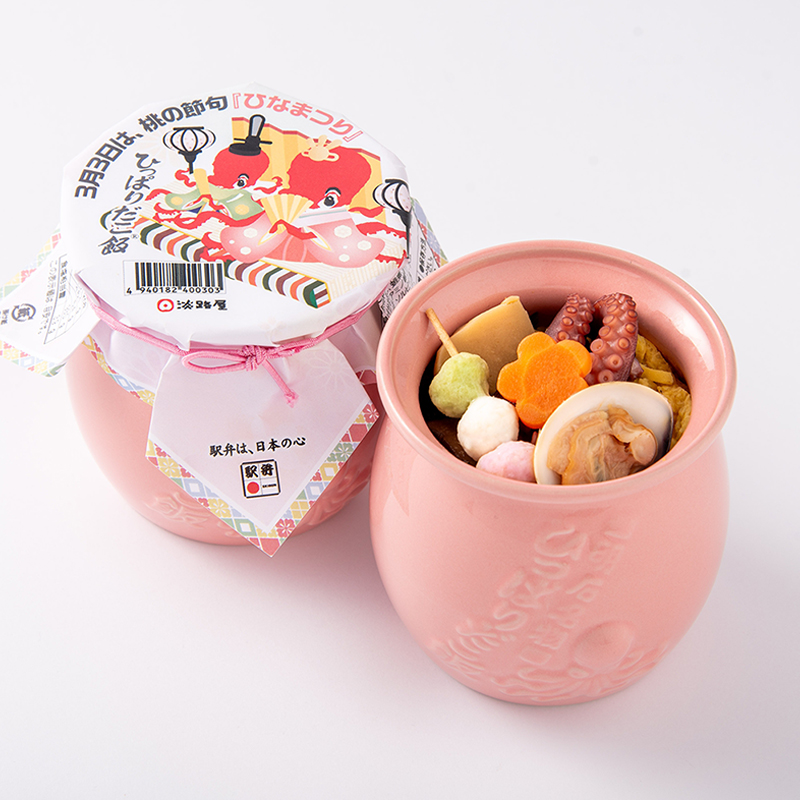 内 容 いつものひっぱりだこ飯の壺を、ひなまつりに合わせて桃色にした特別版です。味付きご飯の上に、真だこの旨煮やはまぐり煮、三色かまぼこなどを華やかに盛り付けました。「男雛と女雛」に扮したタコのイラストを描いた掛け紙。春を感じさせる桃色仕様に仕上げました。女の子の健やかな成長を願う、桃の節句のお祝いにおすすめの一品です。