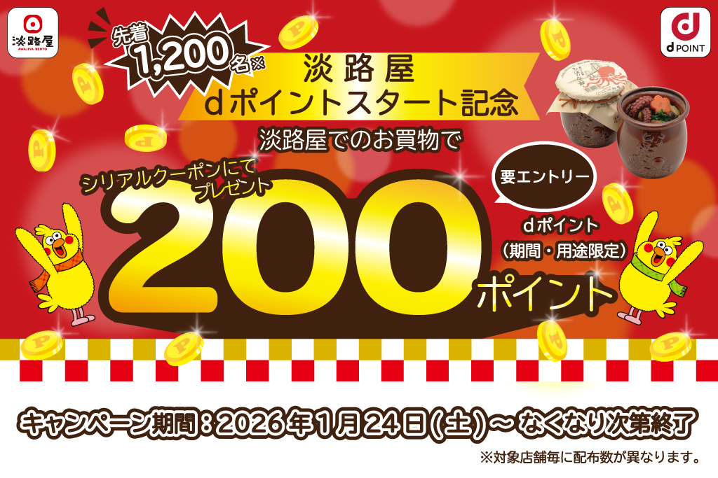 dポイントカードをご掲示のうえ、1pt以上を使用してお買い物をされたお客様に、dポイント(期間・用途限定)200ptのシリアルクーポンをプレゼントいたします。