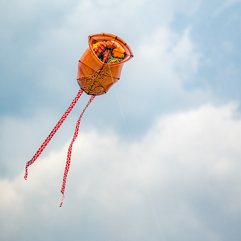 「ひっぱり凧」は、「ひっぱりだこ飯」 の写真をそのまま大きくプリントした凧で あり、糸につながれて空へと引かれていく姿が、まさに“ひっぱりだこ”という名前にふさわしいユーモアあふれる一品です。壺の形状や質感、色合いを忠実に再現したビジュアルを採用し、遠くからでも一目で 「ひっぱりだこ飯」とわかるデザインに仕上げました。